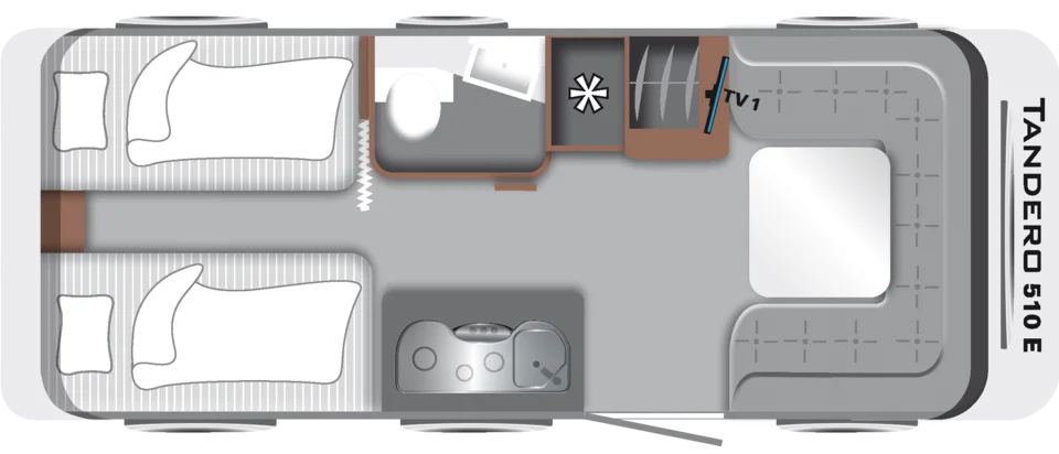 Als neueste Wohnwagenbaureihe präsentiert sich der Tandero mit insgesamt 5 Grundrissen, darunter einen mit Kinderbetten. Er ist der ideale Wohnwagen für Paare mit besonderem Sinn für eine einzigartige Innenraumgestaltung. Das moderne „Japandi“-Design im Taupe-Dekor erzeugt ein großartiges Ambiente, indem es eckige Elemente geschickt mit runden paart.